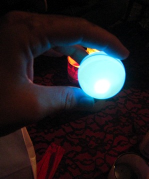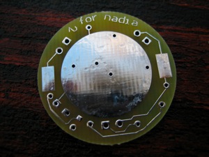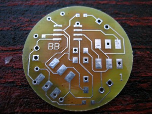 This is the PCB I designed for the project. The large footprint in the picture on the left is for the battery holder, which was a standard CR2032 battery holder modified to hold two batteries, which were needed to provide the voltage for the blue LED.